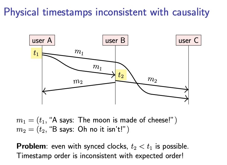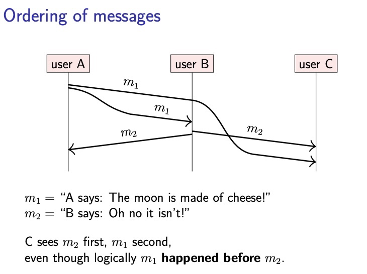 예를 들어서, 3 개의 서버 A, B, C 가 있을 때 아래 그림과 같은 상황이 있다고 해봅시다. 상황은, A 가 m1 의 발화를 하고, 그 답변을 들은 B 가 m2 의 응답을 했다고 할 때, C 에게 전송 되는 순서가 네트워크 문제 등으로 바뀌었다고 할 때 C 는 어떤 것이 먼저 온 것인지 확실히 알 수 있을 까요?